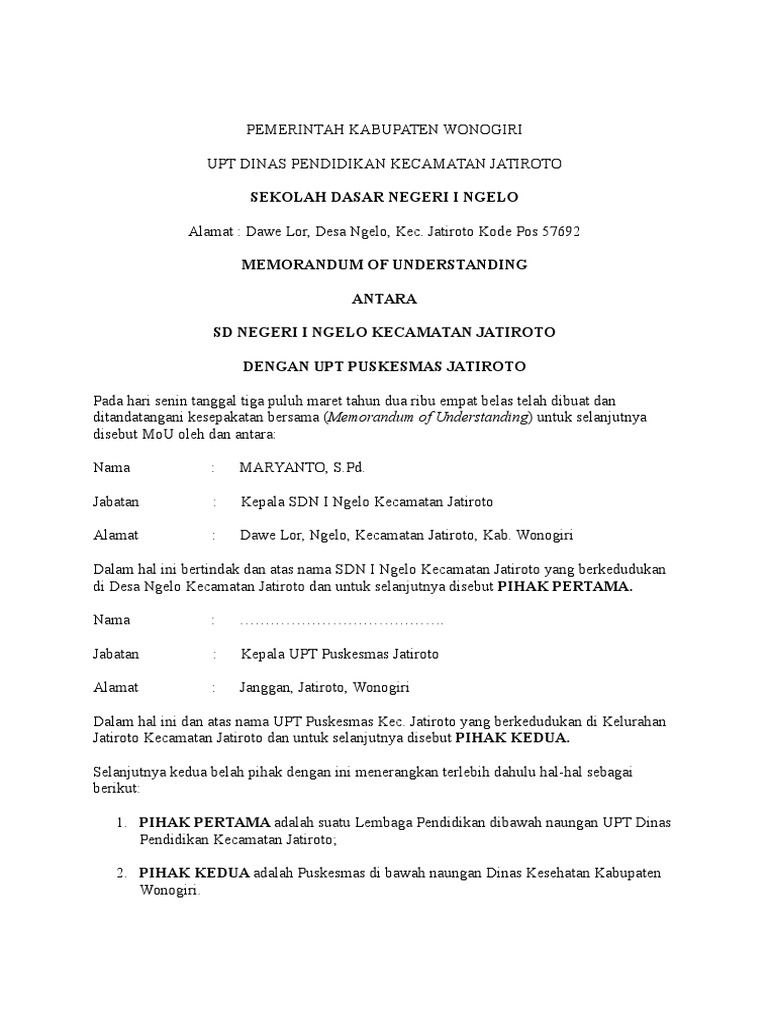 Contoh mou. Isi bagian yang berwarna merah sesuai dengan data dari sekolah mitra. Contoh format surat mou memo of understanding berikut ini adalah sebuah surat perjanjian untuk mengikat dua buah pihak secara hukum sebelum terjadi sebuah kerjasama baik dalam perdagangan niaga usaha dan lain lain. Anda bisa melihat referensi di atas sebagai gambaran isi mou yang baik dan benar dalam pembuatan mou versi anda sendiri.