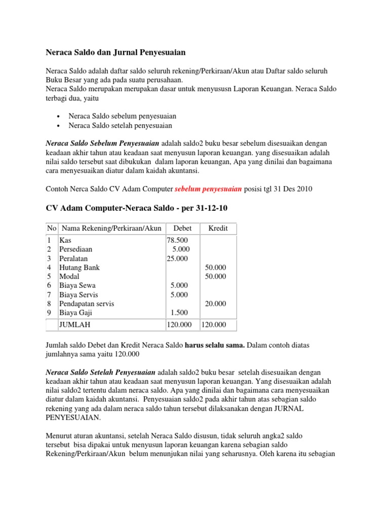 Budi neraca saldo setelah penyesuaian desember 2016 demikianlah pembahasan mengenai neraca saldo setelah penyesuaian perusahaan jasa service dengan contoh jurnal penyesuaian. Neraca saldo sebelum penyesuaian adalah saldo2 buku besar sebelum disesuaikan dengan keadaan akhir tahun atau keadaan saat menyusun laporan keuangan. Contoh nerca saldo cv adam.